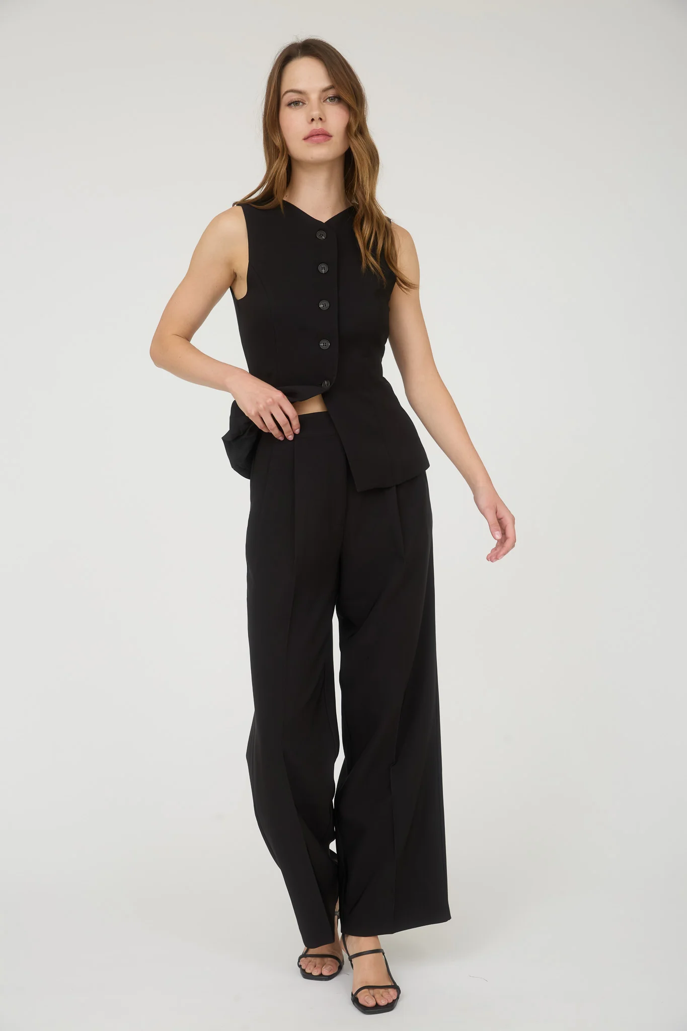 👖 Con pantalones tipo sastre y sandalias para un look elegante