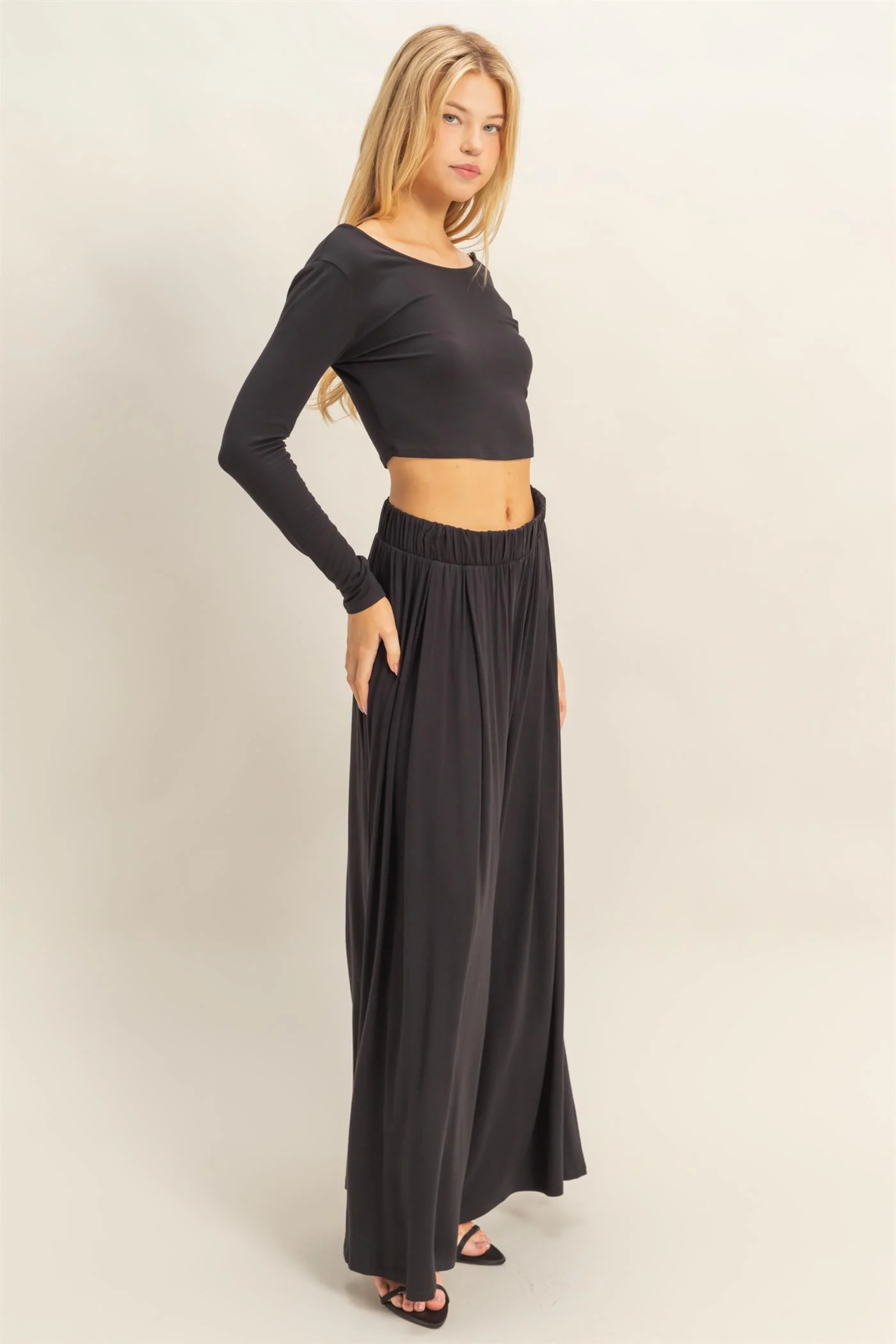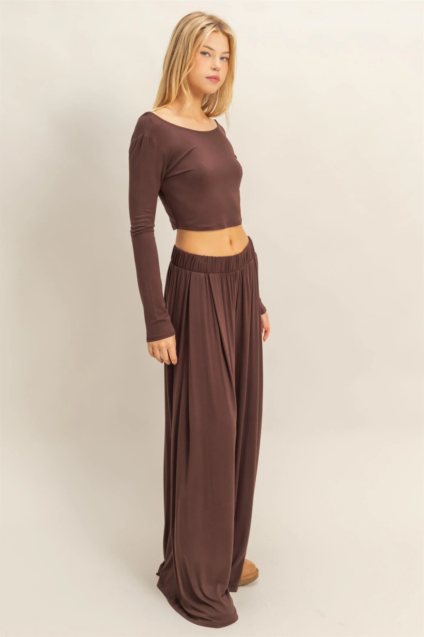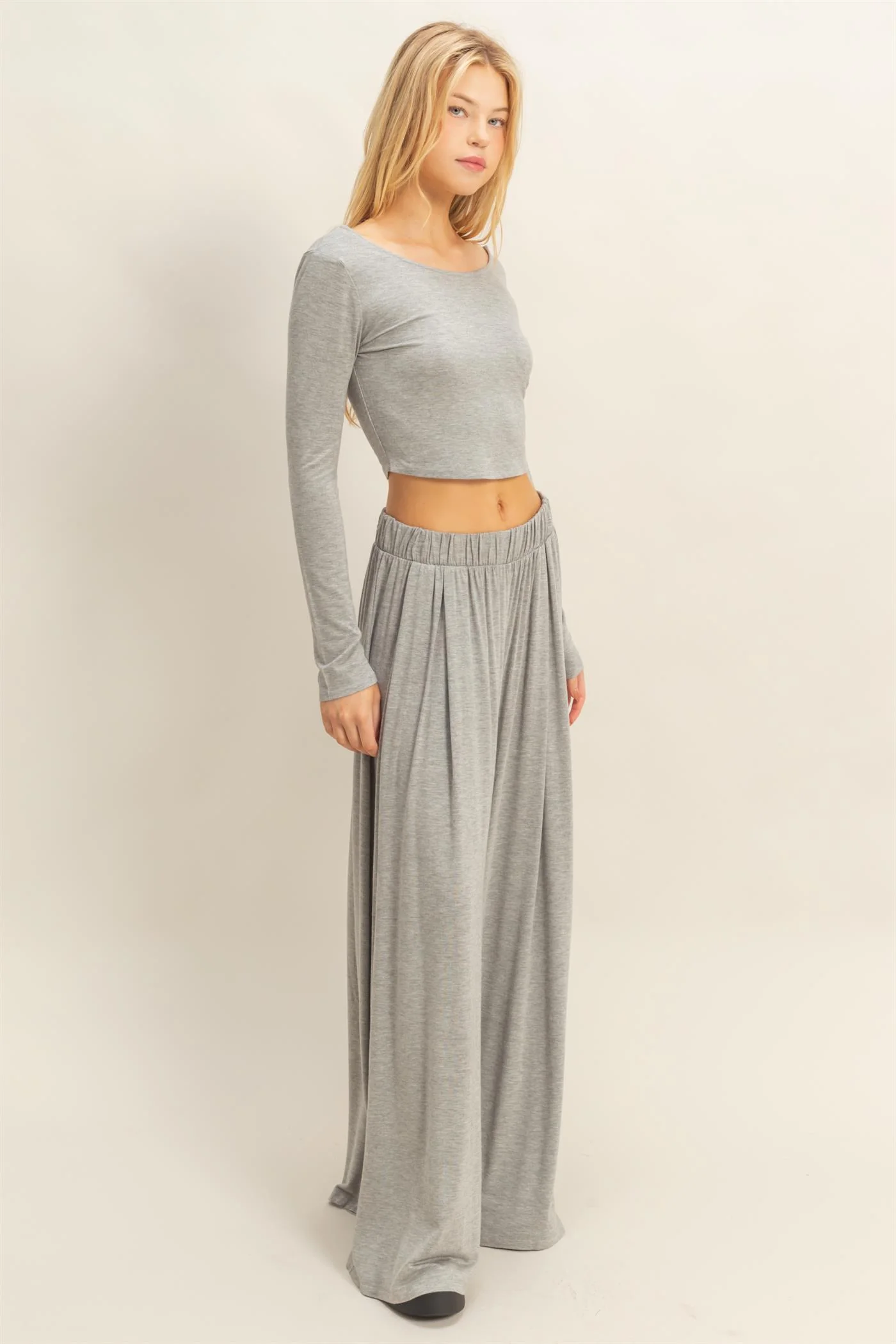 Realza tu armario con este elegante y sencillo conjunto que incluye un elegante top corto de manga larga y un pantalón largo fluido. El top, con un sutil escote barco, realza tu silueta, mientras que la cintura fruncida del pantalón promete comodidad y estilo. Este conjunto logra el equilibrio perfecto entre simplicidad y sofisticación, haciéndolo versátil para diversas ocasiones.