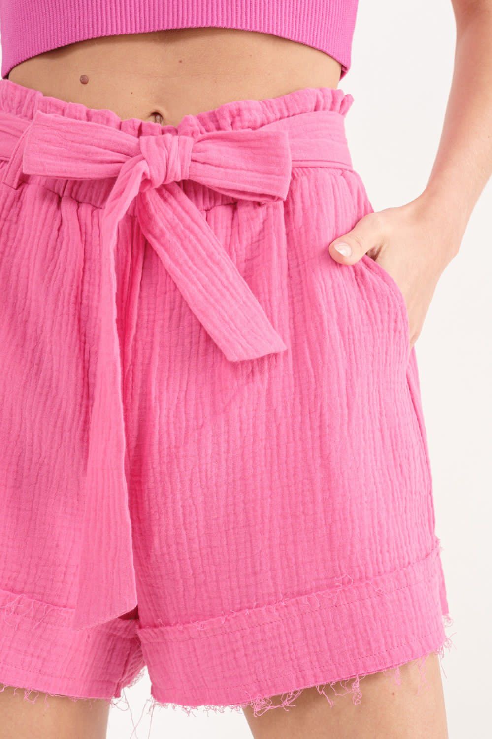Este encantador short rosa de tela ligera y suave es ideal para un look fresco y veraniego. Cuenta con un diseño de lazo en la cintura, que añade un toque femenino y elegante. El short ofrece comodidad con su ajuste relajado y ligero, perfecto para combinar con blusas ajustadas o tops holgados. La tela con textura es transpirable, lo que lo convierte en una excelente opción para los días cálidos. Eleva tu estilo con esta prenda versátil, ideal para ocasiones casuales o de paseo. Este short es perfecto para destacar en cualquier ocasión con un look moderno y a la moda.