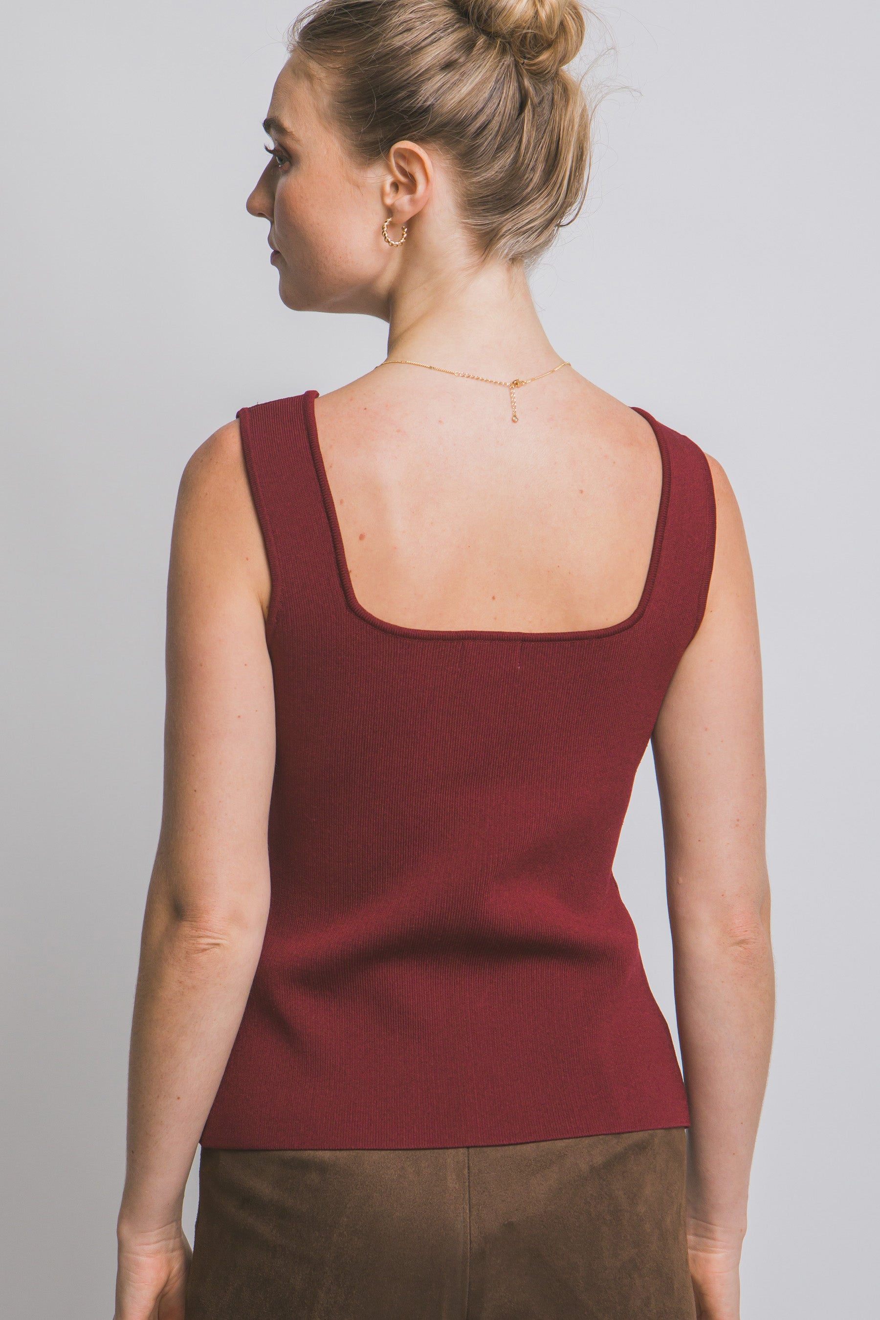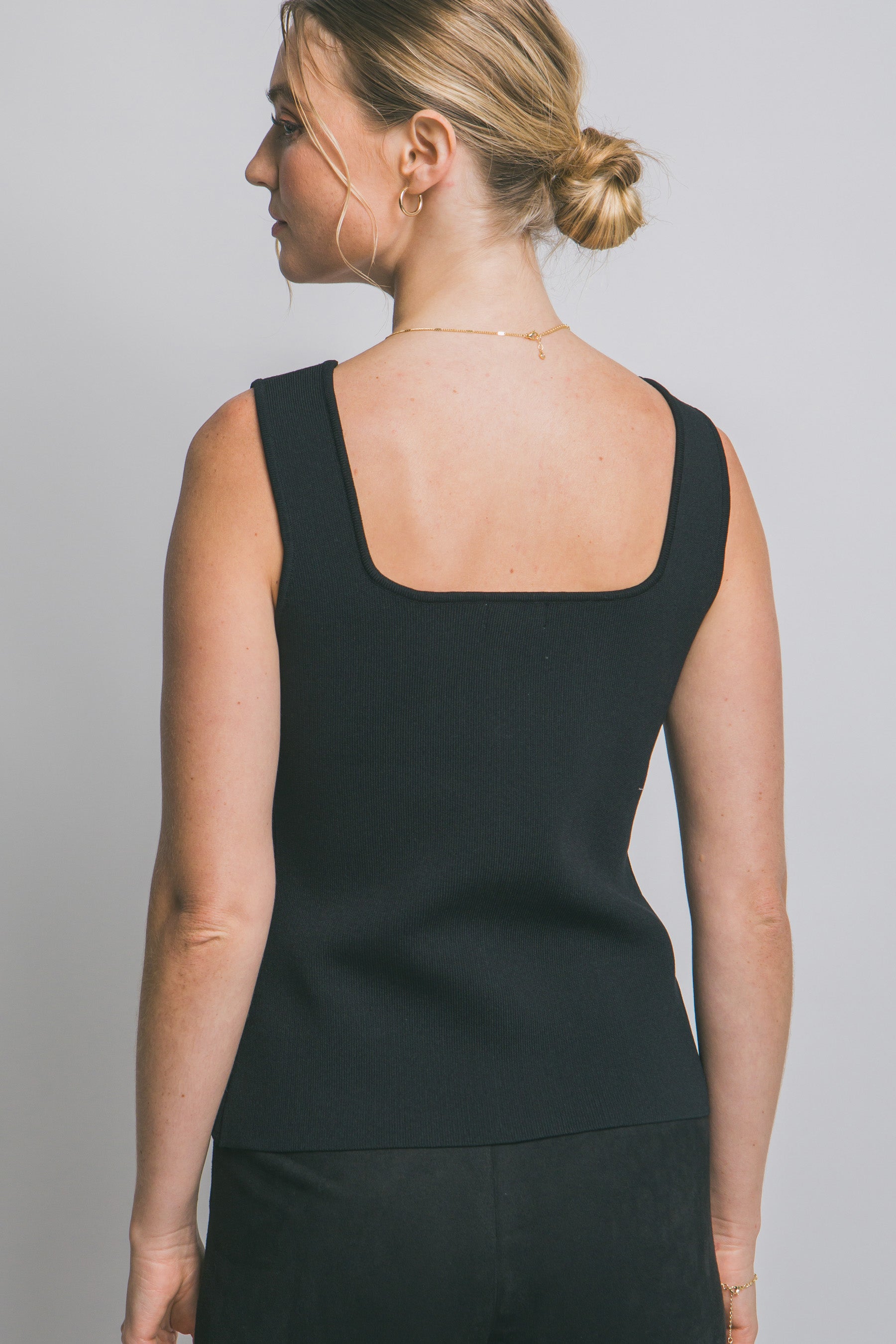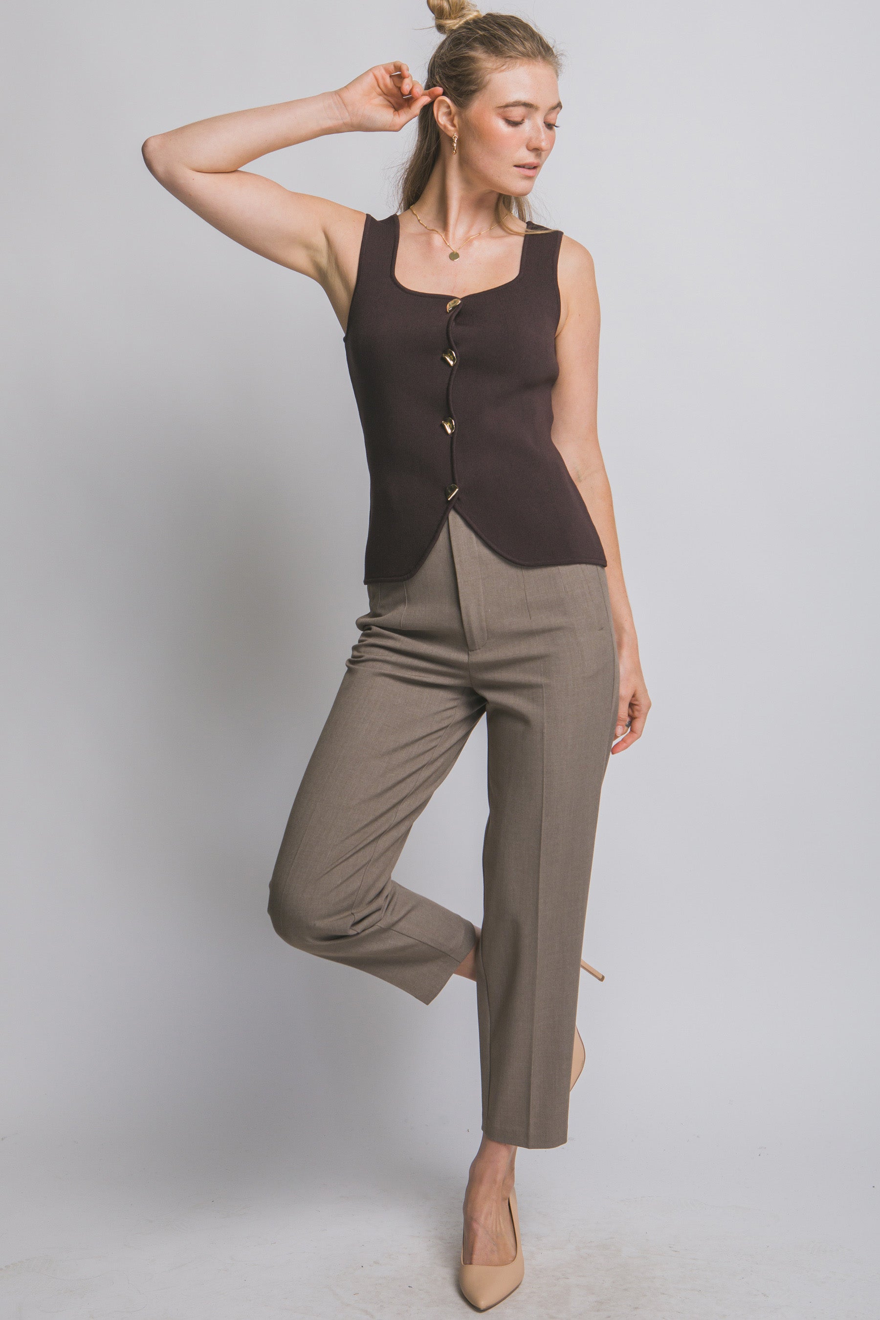 Un básico elevado a otro nivel: este top sin mangas se adapta perfectamente a tu figura con un diseño entallado que realza tu silueta y un detalle de botones dorados que aporta ese toque chic que transforma cualquier outfit.