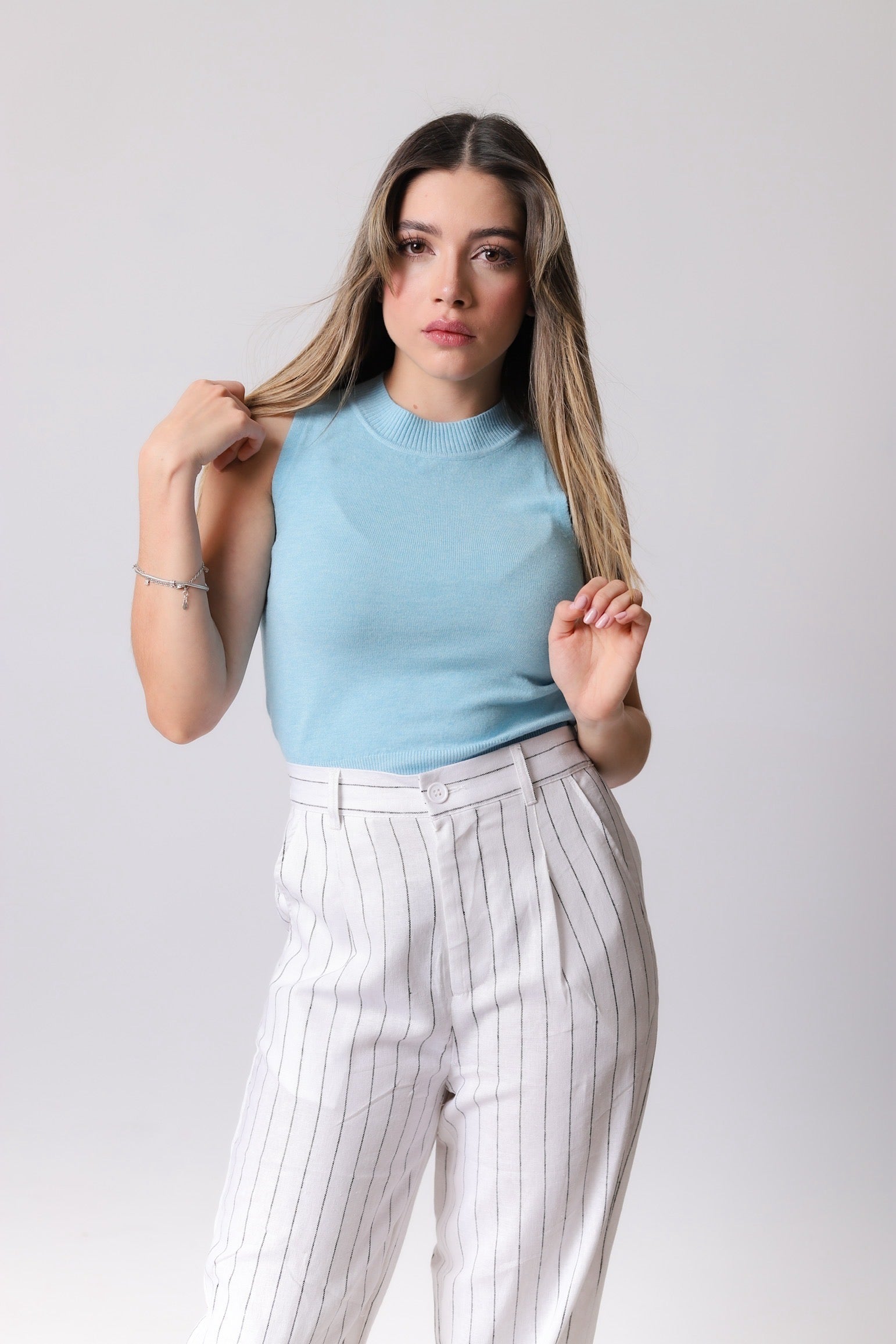 Este top sin mangas de punto ajustado es una opción perfecta para un look casual y sofisticado. Su diseño sencillo y elegante se adapta a la figura, brindando comodidad y estilo. Ideal para combinar con pantalones de tiro alto o faldas para crear un conjunto moderno.