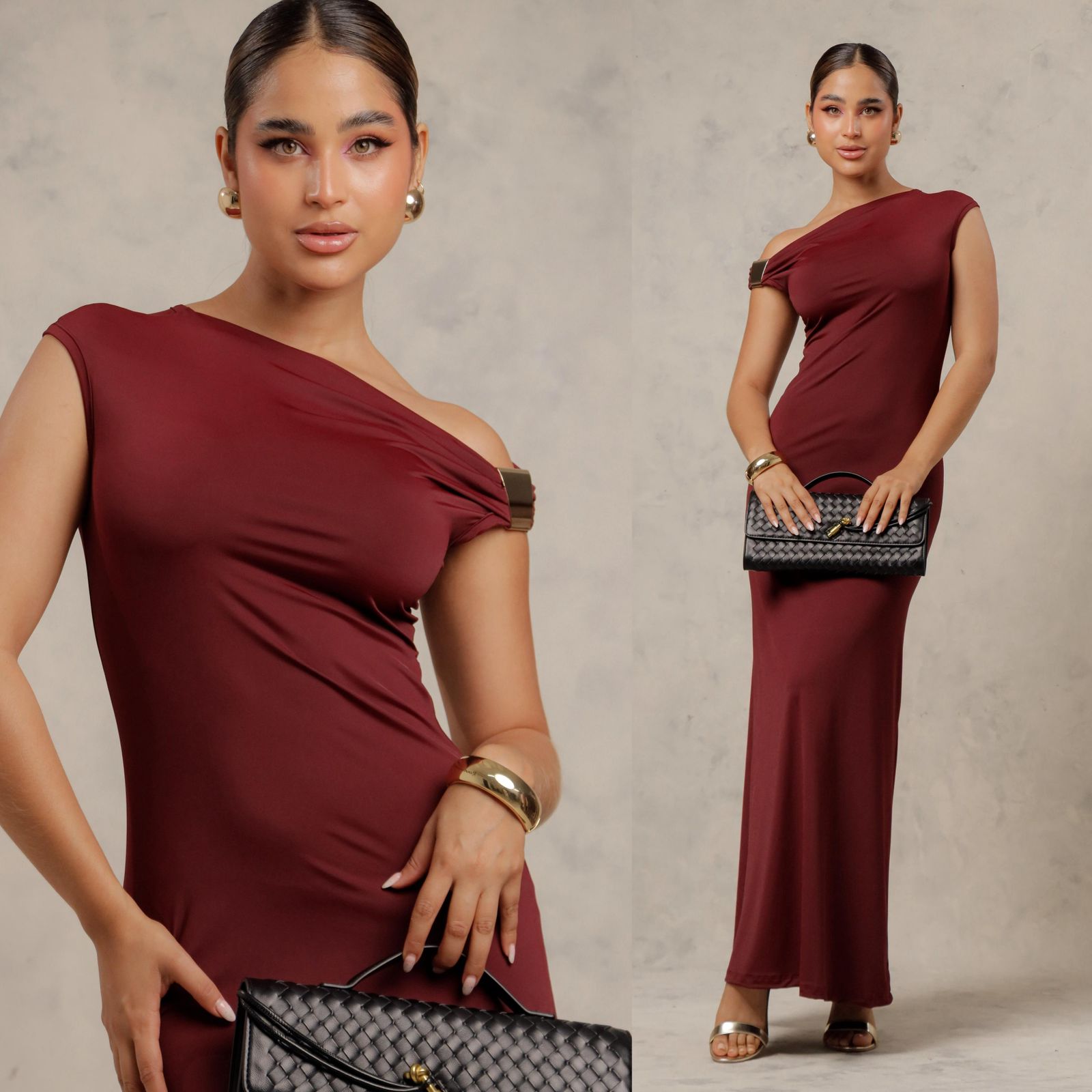 Vestido largo con diseño asimétrico y detalle metálico