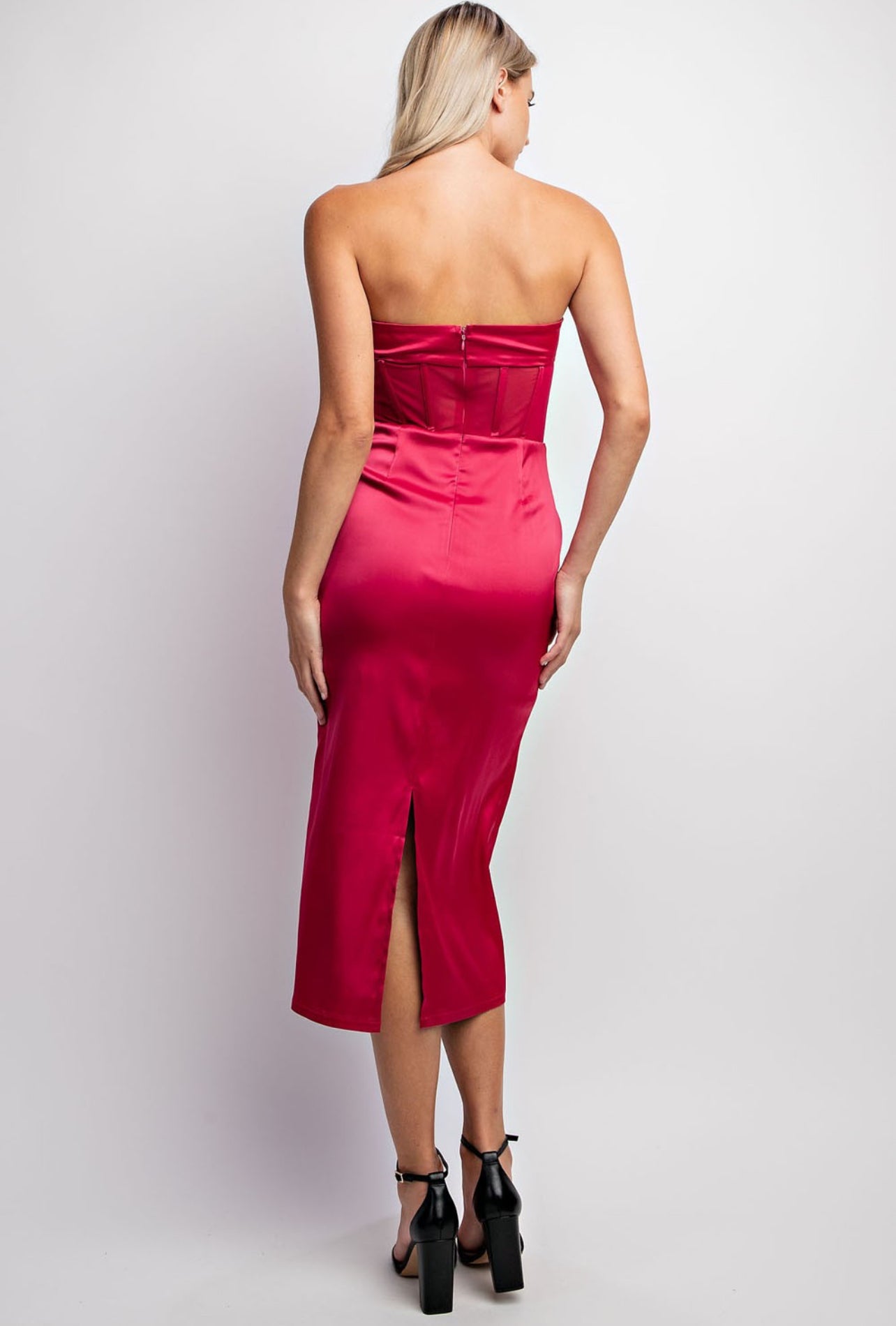 Este elekgante vestido satinado es la elección perfecta para eventos especiales. Con un diseño ajustado que realza la fikgura, cuenta con delicados paneles transparentes en la parte superior que le aportan un toque sensual y moderno. Ideal para combinar con tacones altos para un look sofisticado y atrevido.